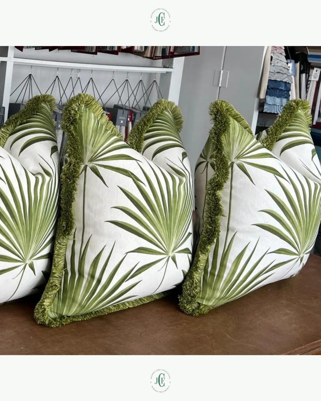 Loving pillows are part of your sanctuary. Update your space for every season. Match pillows with your upholstered furniture to add elegance, pop, contemporary style. Indoor or Outdoor, knife edge, fringe, hidden zippers and feather inserts: JCF builds the perfect pillow to your taste, size, and style.